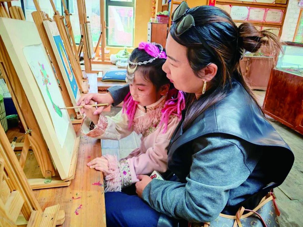 在勒通古镇·千户藏寨,青石板路上人流如织。唐卡绘制、藏香制作、诗歌拓印等非遗体验区前排起长队。一位来自上海的周女士带着孩子体验唐卡绘制,脸上沾着矿物颜料,笑容灿烂:“昨天跳了锅庄舞,学了做藏香,孩子说这是‘最有意思的假期’。”